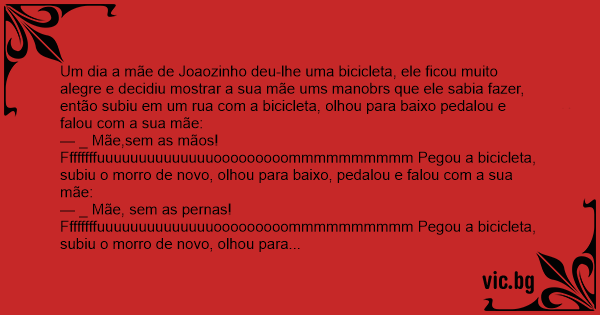Um dia a mãe de Joaozinho deu-lhe uma bicicleta, ele ficou muito alegre e decidiu mostrar a sua mãe ums manobrs que ele sabia fazer, então subiu em um rua com a bicicleta, olhou para baixo pedalou e falou com a sua mãe:
