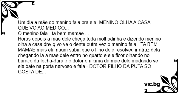 Horas depois a mae dele chega toda molhadinha e dizendo menino olha a casa dnv q vo ve o dente outra vez o menino fala - TA BEM MAMAE mais ela naum sabia que o filho dele resolveu ir atraz dela chegando la a mae dele entro no quarto e ele ficor olhando no buraco da fecha-dura e o dotor em cima da mae dele madando ve ele bate na porta nervoso e fala - DOTOR FILHO DA РUТА SO GOSTA DE ENGANA AGENTE VO PERGUNTA MEU PAI SE A BOCETA DE MAMAE TEM DENTE