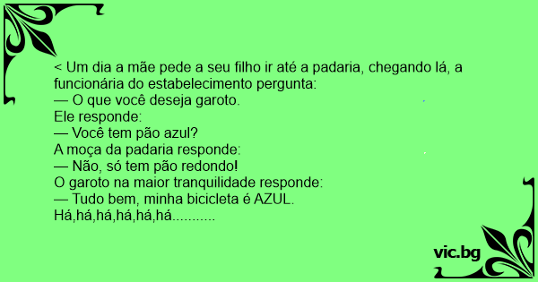 < Um dia a mãe pede a seu filho ir até a padaria, chegando lá, a funcionária do estabelecimento pergunta: