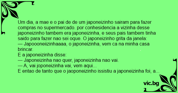 Um dia, a mae e o pai de de um japoneizinho sairam para fazer compras no supermercado. por conhesidencia a vizinha desse japoneizinho tambem era japoneizinha, e seus pais tambem tinha saido para fazer nao sei oque. O japoneizinho grita da janela: