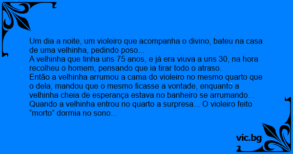 Então a velhinha arrumou a cama do violeiro no mesmo quarto que o dela, mandou que o mesmo ficasse a vontade, enquanto a velhinha cheia de esperança estava no banheiro se arrumando...