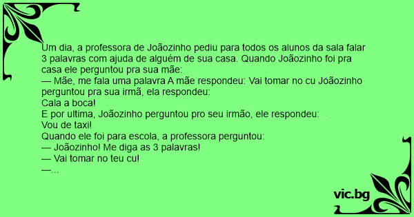 — Mãe, me fala uma palavra A mãe respondeu: Vai tomar no cu Joãozinho perguntou pra sua irmã, ela respondeu:
