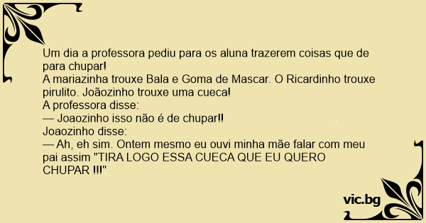 — Ah, eh sim. Ontem mesmo eu ouvi minha mãe falar com meu pai assim "TIRA LOGO ESSA CUECA QUE EU QUERO СНUРАR !!!"
