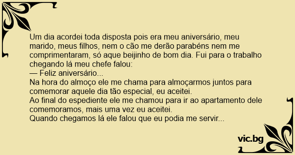 Um dia acordei toda disposta pois era meu aniversário, meu marido, meus filhos, nem o cão me derão parabéns nem me comprimentaram, só aque beijinho de bom dia. Fui para o trabalho chegando lá meu chefe falou: