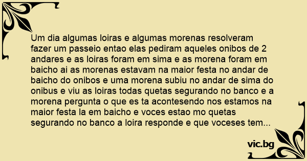 Um dia algumas loiras e algumas morenas resolveram fazer um passeio entao elas pediram aqueles onibos de 2 andares e as loiras foram em sima e as morena foram em baicho ai as morenas estavam na maior festa no andar de baicho do onibos e uma morena subiu no andar de sima do onibus e viu as loiras todas quetas segurando no banco e a morena pergunta o que es ta acontesendo nos estamos na maior festa la em baicho e voces estao mo quetas segurando no banco a loira responde e que voceses tem motorista e nos nao!!!!