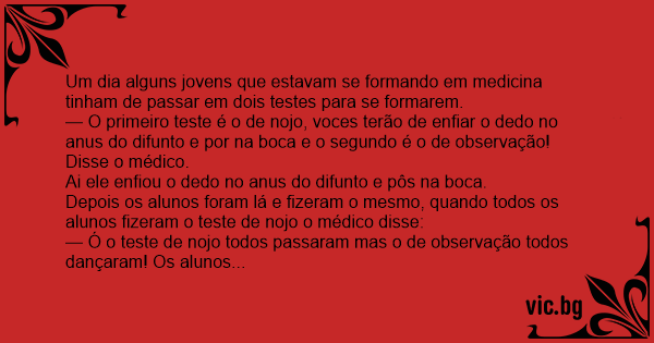 — O primeiro теsте é o de nojo, voces terão de enfiar o dedo no аnus do difunto e por na boca e o segundo é o de observação! Disse o médico.
