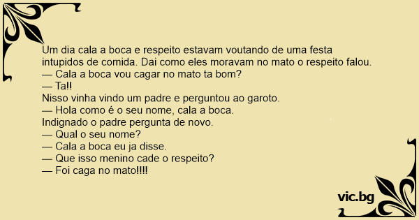 Um dia cala a boca e respeito estavam voutando de uma festa intupidos de comida. Dai como eles moravam no mato o respeito falou.