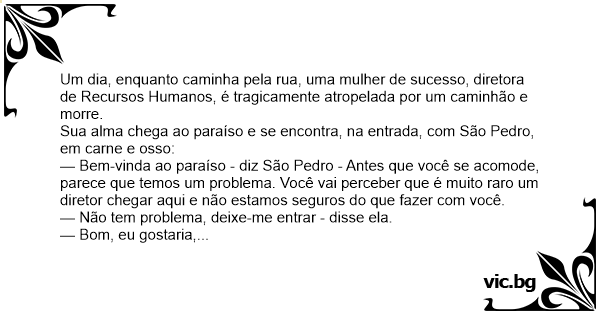 — Bem-vinda ao paraíso - diz São Pedro - Antes que você se acomode, parece que temos um problema. Você vai perceber que é muito raro um diretor chegar aqui e não estamos seguros do que fazer com você.