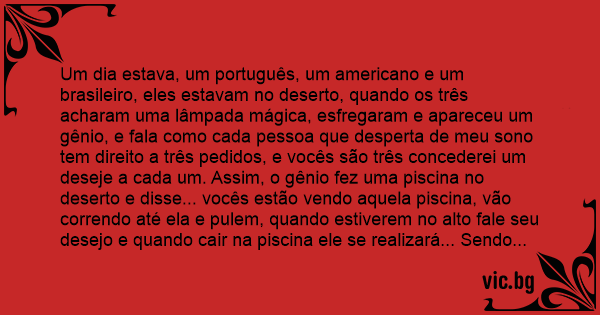 Um dia estava, um português, um americano e um brasileiro, eles estavam no deserto, quando os três acharam uma lâmpada mágica, esfregaram e apareceu um gênio, e fala como cada pessoa que desperta de meu sono tem direito a três pedidos, e vocês são três concederei um deseje a cada um. Assim, o gênio fez uma piscina no deserto e disse... vocês estão vendo aquela piscina, vão correndo até ela e pulem, quando estiverem no alto fale seu desejo e quando cair na piscina ele se realizará... Sendo assim, foi o brasileiro, correu, pulou e gritou... mulher, e piscina estava cheia de mulher. logo em seguida, foi o americano, correu, pulou e gritou... dinheiro, e a piscina estava cheia de dinheiro. Depois foi o português, correu, tropeçou e exclamou, hooooó меrdа.....