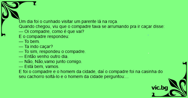 E foi o compadre e o homem da cidade, daí o compadre foi na casinha do seu сасhоrrо soltá-lo e o homem da cidade perguntou: