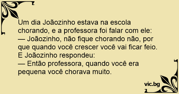 Um dia Joãozinho estava na escola chorando, e a professora foi falar com ele: