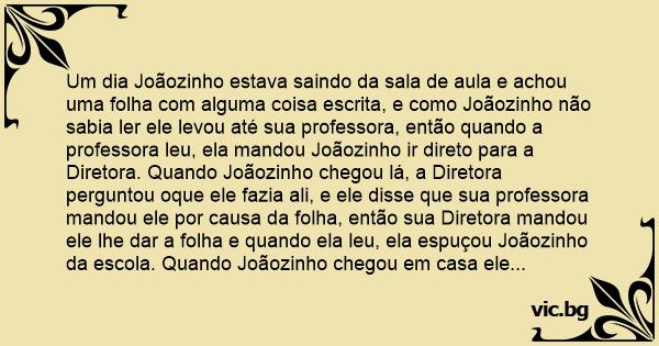 Um dia Joãozinho estava saindo da sala de aula e achou uma folha com alguma coisa escrita, e como Joãozinho não sabia ler ele levou até sua professora, então quando a professora leu, ela mandou Joãozinho ir direto para a Diretora. Quando Joãozinho chegou lá, a Diretora perguntou oque ele fazia ali, e ele disse que sua professora mandou ele por causa da folha, então sua Diretora mandou ele lhe dar a folha e quando ela leu, ela espuçou Joãozinho da escola. Quando Joãozinho chegou em casa ele explicou a sua mãe, então ela pediu a folha, e quando ela leu, ela espuçou Joãozinho de casa. Joãozinho estava andando pela rua triste quando o Guarda perguntou oque houve, e então ele mostrou a folha, quando ele leu a folha o Guarda lógo levou Joãozinho a delegacia. Chegando a delegacia, o Delegado perguntou oque houve para o Guarda, então o Guarda disse para ele ler a folha. Depois que o Delegado leu a folha, ele pegou uma arma e deu um tiro na cabeça de Joãozinho, e Joãozinho morreu. Chegando no céu, Deus perguntou para Joãozinho como e porque ele morreu, e Joãozinho disse que ele morreu com um tiro na cabeça do Delegado e porque ele leu uma folha, então Deus perguntou que folha era, então Joãozinho deu a folha para Deus, e quando Deus leu, ele mandou Joãozinho para o inferno. Chegando no inferno o Diabo perguntou como ele veio parar aqui, e Joãozinho disse que foi a folha, então quando Joãozinho foi entregar ao Diabo ele falou para o Diabo falar em voz auta que ele não aguentava mais não saber oque era, então quando o Diabo foi ler, a folha queimou em sua mão de tão quente que ela era.