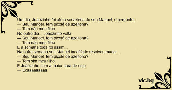 Um dia, Joãozinho foi até a sorveteria do seu Manoel, e perguntou: