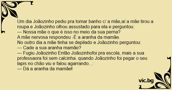Um dia Joãozinho pediu pra tomar banho c/ a mãe,aí a mãe tirou a roupa e Joãozinho olhou assustado para ela e perguntou: