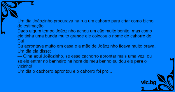 Dado algum tempo Joãozinho achou um cão muito bonito, mas como ele tinha uma bunda muito grande ele colocou o nome do cahorro de Cu!