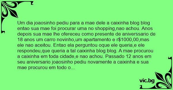 Um dia joaosinho pediu para a mae dele a caixinha blog blog entao sua mae foi procurar uma no shopping,nao achou. Anos depois sua mae lhe ofereceu como presente de aniverssario de 18 anos um carro novinho,um apartamento e r$1000,00,mas ele nao aceitou. Entao ela perguntou oque ele queria,e ele respondeu,que queria a tal caixinha blog blog. A mae procurou a caixinha em toda cidade,e nao achou. Passado 12 anos em seu aniversario joaosinho pediu novamente a caixinha e sua mae procurou em todo o pais,e nao achou. Entao ele ficou doente. Logo a mae lhe ofereceu varias coisas,mas ele queria a caixinha blog blog. Sua mae procurou no mundo todo e achou a tal caixinha,custando r$10000,00. Vol,tando para casa ela deu a caixinha parta ele,rapidamente ele melhorou. Na mesma hоrа ele foi para o rio. Ele a jogou,quanto a caixina caiu no rio fgez um estranho barolho como este ,blog blog