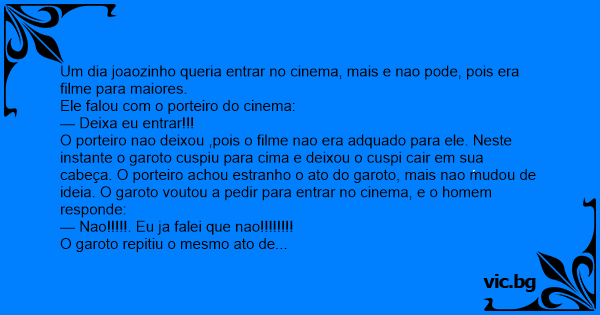 Um dia joaozinho queria entrar no cinema, mais e nao pode, pois era filme para maiores.