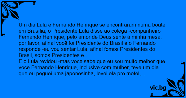 Um dia Lula e Fernando Henrique se encontraram numa boate em Brasília, o Presidente Lula disse ao colega -companheiro Fernando Henrique, pelo amor de Deus sente à minha mesa, por favor, afinal você foi Presidente do Brasil e o Fernando responde -eu vou sentar Lula, afinal fomos Presidentes do Brasil, somos Presidentes e..