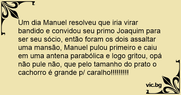 Um dia Manuel resolveu que iria virar bandido e convidou seu primo Joaquim para ser seu sócio, então foram os dois assaltar uma mansão, Manuel pulou primeiro e caiu em uma antena parabólica e logo gritou, opá não pule não, que pelo tamanho do prato o сасhоrrо é grande p/ саrаlhо!!!!!!!!!