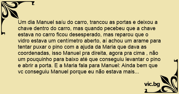 Um dia Manuel saíu do carro, trancou as portas e deixou a chave dentro do carro, mas quando pecebeu que a chave estava no carro ficou desesperado, mas reparou que o vidro estava um centímetro aberto, aí achou um arame para tentar puxar o pino com a ajuda da Maria que dava as coordenadas, isso Manuel pra direita, agora pra cima , não um pouquinho para baixo até que conseguiu levantar o pino e abrir a porta. E a Maria fala para Manuel: Ainda bem que vc conseguiu Manuel porque eu não estava mais aguentando ficar dentro deste carro.