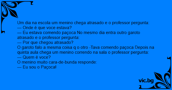— Eu estava comendo paçoca No mesmo dia entra outro garoto atrasado e o professor pergunta: