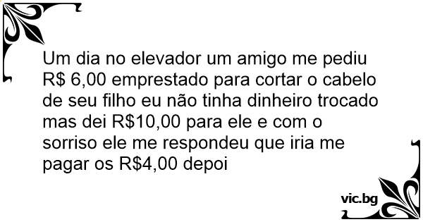Um dia no elevador um amigo me pediu R$ 6,00 emprestado para cortar o cabelo de seu filho eu não tinha dinheiro trocado mas dei R$10,00 para ele e com o sorriso ele me respondeu que iria me pagar os R$4,00 depoi