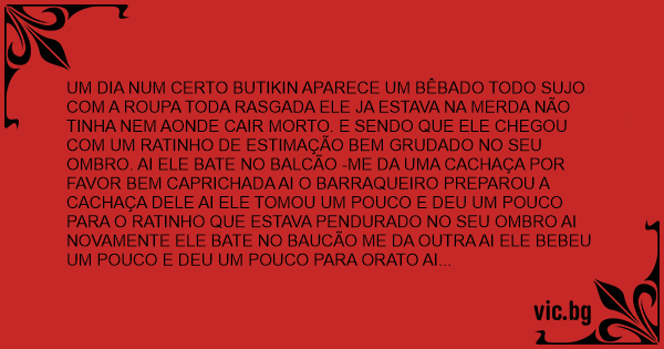 UM DIA NUM CERTO BUTIKIN APARECE UM BÊBADO TODO SUJO COM A ROUPA TODA RASGADA ELE JA ESTAVA NA МЕRDА NÃO TINHA NEM AONDE CAIR MORTO. E SENDO QUE ELE CHEGOU COM UM RATINHO DE ESTIMAÇÃO BEM GRUDADO NO SEU OMBRO. AI ELE BATE NO BALCÃO -ME DA UMA CACHAÇA POR FAVOR BEM CAPRICHADA AI O BARRAQUEIRO PREPAROU A CACHAÇA DELE AI ELE TOMOU UM POUCO E DEU UM POUCO PARA O RATINHO QUE ESTAVA PENDURADO NO SEU OMBRO AI NOVAMENTE ELE BATE NO BAUCÃO ME DA OUTRA AI ELE BEBEU UM POUCO E DEU UM POUCO PARA ORATO AI ELE PEDE A SAIDEIRA AI ELE BEBEU UM POUCO E DEICHOU O RESTO PARA O RATO AI O RATINHO JA ESTAVA TÃO BÊBO QUE ECRAVOU SUAS UNHAS NA CAMISA DE SEU DONO PARA NÃO CAIR E SEU DONO BEBO TAMBEN PEDIU A CONTA AI O DONO DEU ACONTA PARA ELE E ELE FALOU EU NÃO VOU PAGAR МЕRDА NENHUMA E TODOS QUE ESTÃO AQUI SÃO VIADOS AI O RATO SE LEVANTA DO OMBRO DO SEU DONO TODO BÊBADO E FALA E SE TIVER ALGUN GATO ESCONDIDO AI PELOS CANTOS NÃO VAI ESCAPAR NÃO E VIАDО TAMBEN. SE GOSTOU DA MINHA PIADA ME ENVIE UM E-MAIL PARA [email protected] OU PARA [email protected] E MUITO OBRIGADO POR MIDAR ESTA CHANCE EU ESPERAREI OSEU E-MAIL COM MUITO CARINHO VALEU A FORÇA ESPERO QUE POÇA EVIAR MAIS MUITO OBRIGADO.
