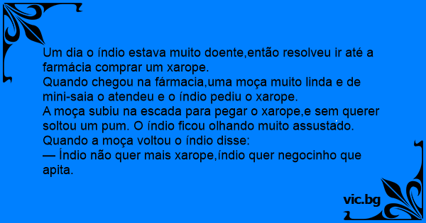 Quando chegou na fármacia,uma moça muito linda e de mini-saia o atendeu e o índio pediu o xarope.