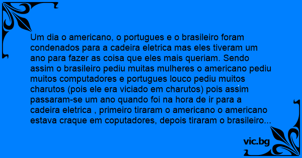 Um dia o americano, o portugues e o brasileiro foram condenados para a cadeira eletrica mas eles tiveram um ano para fazer as coisa que eles mais queriam. Sendo assim o brasileiro pediu muitas mulheres o americano pediu muitos computadores e portugues louco pediu muitos charutos (pois ele era viciado em charutos) pois assim passaram-se um ano quando foi na hоrа de ir para a cadeira eletrica , primeiro tiraram o americano o americano estava craque em coputadores, depois tiraram o brasileiro cheio de filhos depois quando era a vez to portugues eles abriram a porta e viram o portugues com um charuto na boca e com as pernas tremendo todos curiosos perguntaram o que aconteceu? e o portugues perguntou:pelo amor de deus alguem tem um esqueiro?