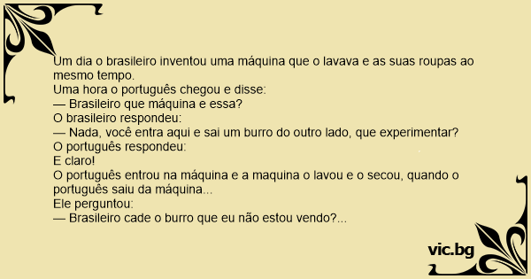 O português entrou na máquina e a maquina o lavou e o secou, quando o português saiu da máquina...