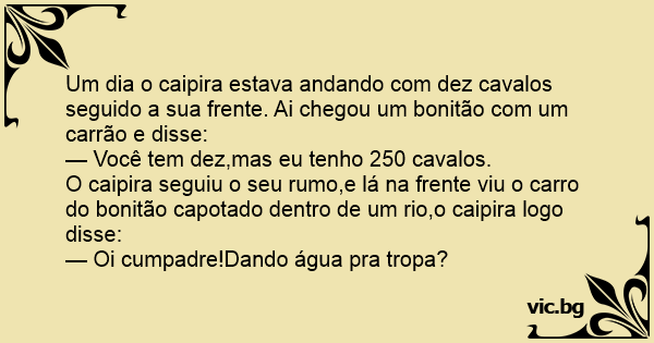 Um dia o caipira estava andando com dez cavalos seguido a sua frente. Ai chegou um bonitão com um carrão e disse:
