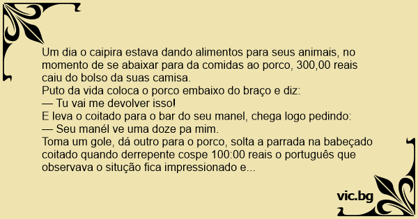 Toma um gole, dá outro para o роrсо, solta a parrada na babeçado coitado quando derrepente cospe 100:00 reais o português que observava o situção fiса impressionado e oferece pro caipira.