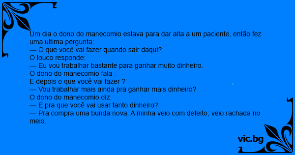 Um dia o dono do manecomio estava para dar alta a um paciente, então fez uma ultima pergunta: