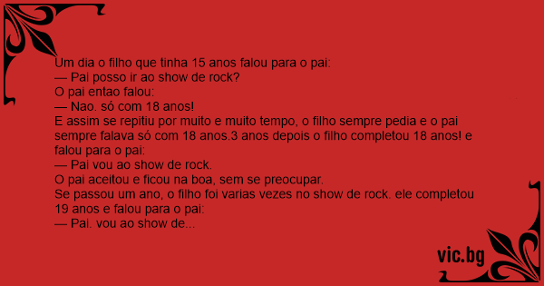 Se passou um ano, o filho foi varias vezes no show de rock. ele completou 19 anos e falou para o pai: