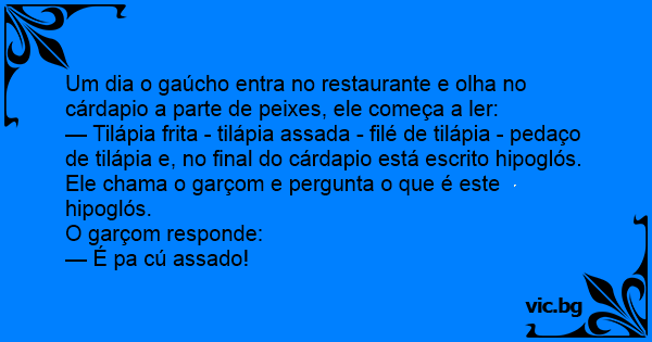 Um dia o gaúcho entra no restaurante e olha no cárdapio a parte de peixes, ele começa a ler: