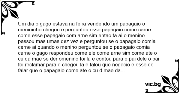 Um dia o gago estava na feira vendendo um papagaio o menininho chegou e perguntou esse papagaio come carne come esse papagaio com arne sim entao ta ai o menino passou mas umas dez vez e perguntou se o papagaio comia carne ai quando o menino perguntou se o papagaio comia carne o gago respondeu come ele come arne sim come ate o cu da mae se der omenino foi la e contou para o pai dele o pai foi reclamar para o chegou la e falou que negocio e esse de falar que o papagaio come ate o cu d mae da voce nao entendeu da mae dele do papagaio