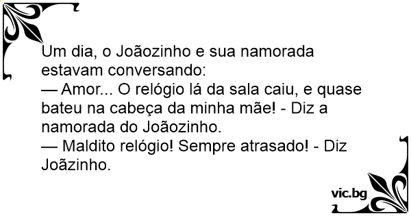 Um dia, o Joãozinho e sua namorada estavam conversando:<br />— Amor... O relógio lá da sala caiu, e quase bateu na cabeça da minha mãe! - Diz a namorada do Joãozinho.<br />— Маldiто relógio! Sempre atrasado! - Diz Joãzinho.