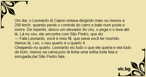Um dia, o Leonardo di Caprio estava dirigindo mais ou menos a 200 km/h, quando perde o controle do carro e bate num poste e morre. De repente, desce um elevador do céu, o pega e o leva até lá. Lá no céu, ele encontra com São Pedro, que diz: