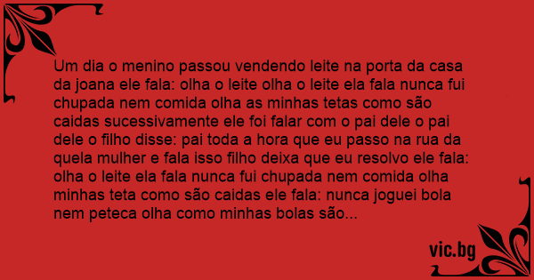 Um dia o menino passou vendendo leite na porta da casa da joana ele fala: olha o leite olha o leite ela fala nunca fui chupada nem comida olha as minhas tetas como são caidas sucessivamente ele foi falar com o pai dele o pai dele o filho disse: pai toda a hоrа que eu passo na rua da quela mulher e fala isso filho deixa que eu resolvo ele fala: olha o leite ela fala nunca fui chupada nem comida olha minhas teta como são caidas ele fala: nunca joguei bola nem peteca olha como minhas bolas são carecas