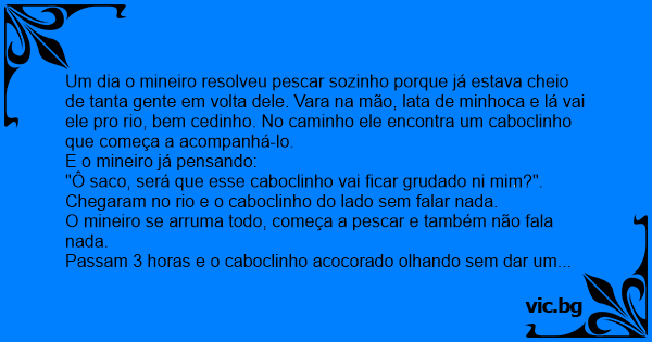 Um dia o mineiro resolveu pescar sozinho porque já estava cheio de tanta gente em volta dele. Vara na mão, lata de minhoca e lá vai ele pro rio, bem cedinho. No caminho ele encontra um caboclinho que começa a acompanhá-lo.
