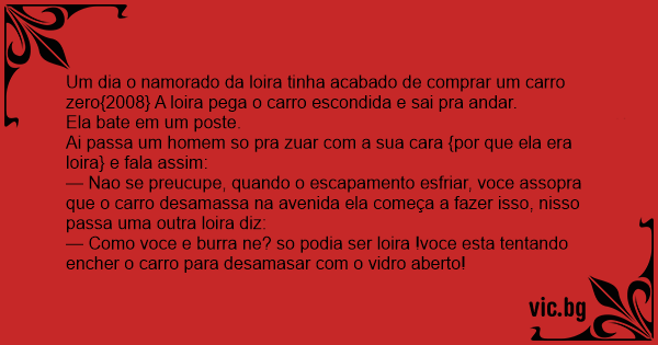 A loira para o caro no supermercado e quando volta, nota um amassado na lateral do carro, nisso passa um cara e diz o seguinde?: — Assopra no escapamento que desamassa!! Então a loira começa a...