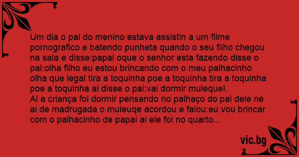 Um dia o pai do menino estava assistin a um filme pornografico e batendo рunhета quando o seu filho chegou na sala e disse:papai oque o senhor esta fazendo disse o pai:olha filho eu estou brincando com o meu palhacinho olha que legal tira a toquinha poe a toquinha tira a toquinha poe a toquinha ai disse o pai:vai dormir muleque!.