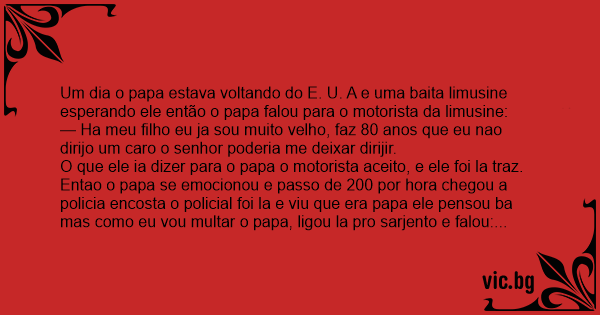Entao o papa se emocionou e passo de 200 por hоrа chegou a policia encosta o policial foi la e viu que era papa ele pensou ba mas como eu vou multar o papa, ligou la pro sarjento e falou:
