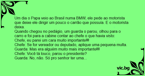 Um dia o Papa veio ao Brasil numa BMW, ele pede ao motorista que deixe ele dirigir um pouco o carrão que possuía. E o motorista deixa.