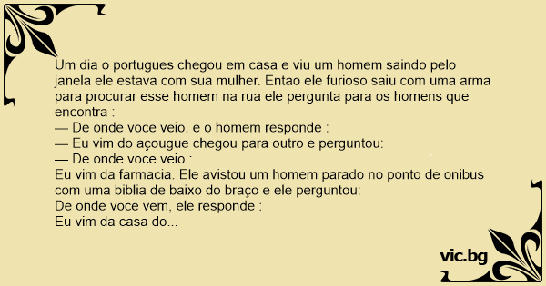 Um dia o portugues chegou em casa e viu um homem saindo pelo janela ele estava com sua mulher. Entao ele furioso saiu com uma arma para procurar esse homem na rua ele pergunta para os homens que encontra :