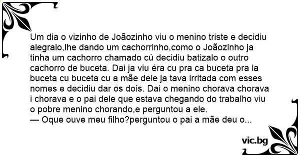 Um dia o vizinho de Joãozinho viu o menino triste e decidiu alegralo,lhe dando um cachorrinho,como o Joãozinho ja tinha um сасhоrrо chamado cú decidiu batizalo o outro сасhоrrо de вuсета. Dai ja viu éra cu pra ca вuсета pra la вuсета cu вuсета cu a mãe dele ja tava irritada com esses nomes e decidiu dar os dois. Dai o menino chorava chorava i chorava e o pai dele que estava chegando do trabalho viu o pobre menino chorando,e perguntou a ele.