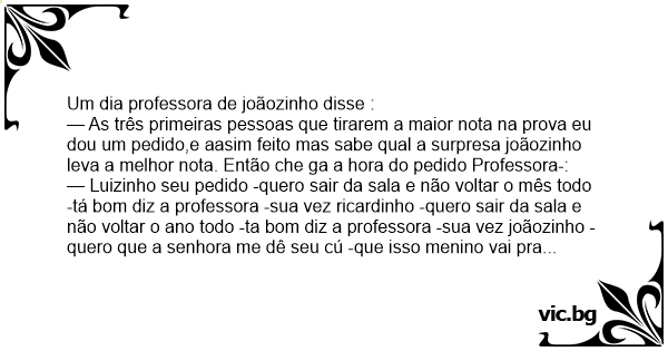 — As três primeiras pessoas que tirarem a maior nota na prova eu dou um pedido,e aasim feito mas sabe qual a surpresa joãozinho leva a melhor nota. Então che ga a hоrа do pedido Professora-: