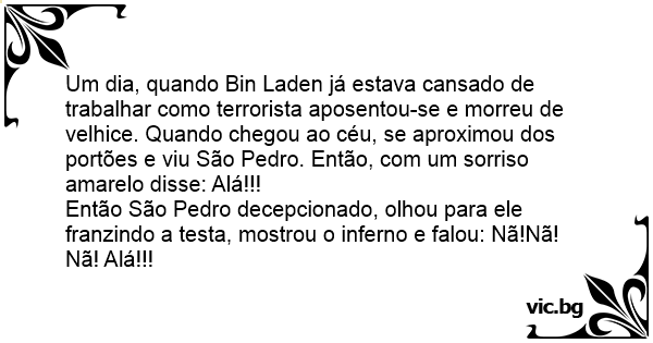 Um dia, quando Bin Laden já estava cansado de trabalhar como terrorista aposentou-se e morreu de velhice. Quando chegou ao céu, se aproximou dos portões e viu São Pedro. Então, com um sorriso amarelo disse: Alá!!!