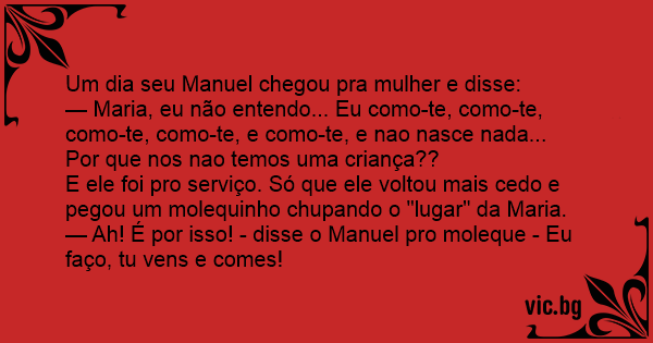 — Ah! É por isso! - disse o Manuel pro moleque - Eu faço, tu vens e comes!