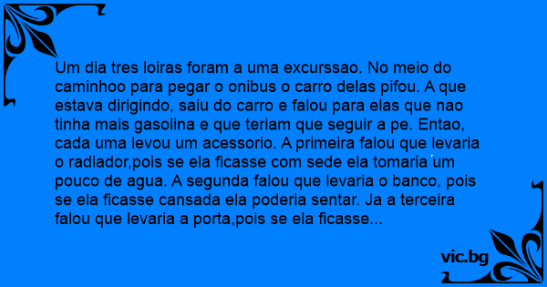 Um dia tres loiras foram a uma excurssao. No meio do caminhoo para pegar o onibus o carro delas pifou. A que estava dirigindo, saiu do carro e falou para elas que nao tinha mais gasolina e que teriam que seguir a pe. Entao, cada uma levou um acessorio. A primeira falou que levaria o radiador,pois se ela ficasse com sede ela tomaria um pouco de agua. A segunda falou que levaria o banco, pois se ela ficasse cansada ela poderia sentar. Ja a terceira falou que levaria a porta,pois se ela ficasse com calor ela abriria o vidro.